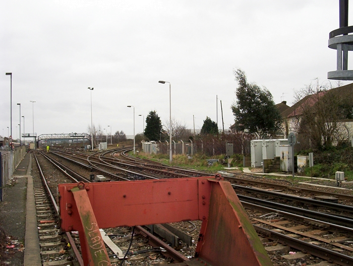 A Dartford-bound view shows the double-track loop branching off towards Barnehurst. Another such spur exists at the Dartford end of the layout, thus creating a triangular junction. In the background is a footbridge linking the depot with five more sidings on the ''up'' side of the running lines. © David Glasspool