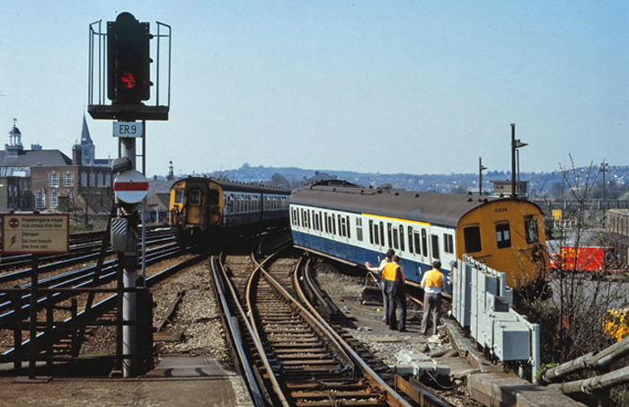 This series of photographs shows 4-CAP No. 3304 having come to grief at the northern end of Rochester station, in 1985. It appears that unit has over-run the ''down'' loop, putting the leading vehicle in a rather precarious position above the goods yard! The 4-CAP units first emerged in 1982, and were the result of permanently coupling a pair of 2-HAP units into a single formation. The recovery of No. 3304 was begun by the splitting up of the 4-CAP into its component 2-HAP units.
