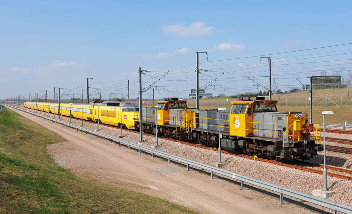 Through the Chunnel and along HS1, the TGV was hauled by a pair of Eurotunnel's Class 0001 diesels, given that the postal unit did not have clearance for operation under its own power. For Chunnel working, the diesel locomotives are fitted with exhaust filters. The formation arrived at St Pancras' platform 5 in the early hours of 21st March 2012, the TGV being pushed into the platform by the diesels. This move was achieved by the formation traversing the little-used triangular junction between HS1 and the North London Line, to reverse direction. The diesels were detached and stabled in the siding situated in-between the approaches to platform Nos. 7 and 8. The pair then hauled the TGV out of St Pancras at approximately 11:45 AM, the platform being needed for standard Eurostar services, and for the afternoon the formation was parked in the "up" loop at Singlewell. A facing crossover between the running lines, north west of Singlewell Loops, allows trains heading in the "down" direction to switch over to the "up" line; similarly, a trailing crossover south east of the loops allows a train to rejoin the "down" line from the "up" track. The formation returned to the Chunnel in the evening.