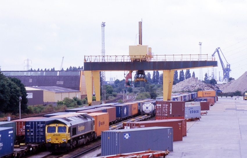 An eastward view includes Class 66 No. 66567 and one of the original "Goliath" cranes. The latter was replaced in 2012 by much larger cranes manufactured by German-Swiss company "Liebherr". © David Glasspool Collection