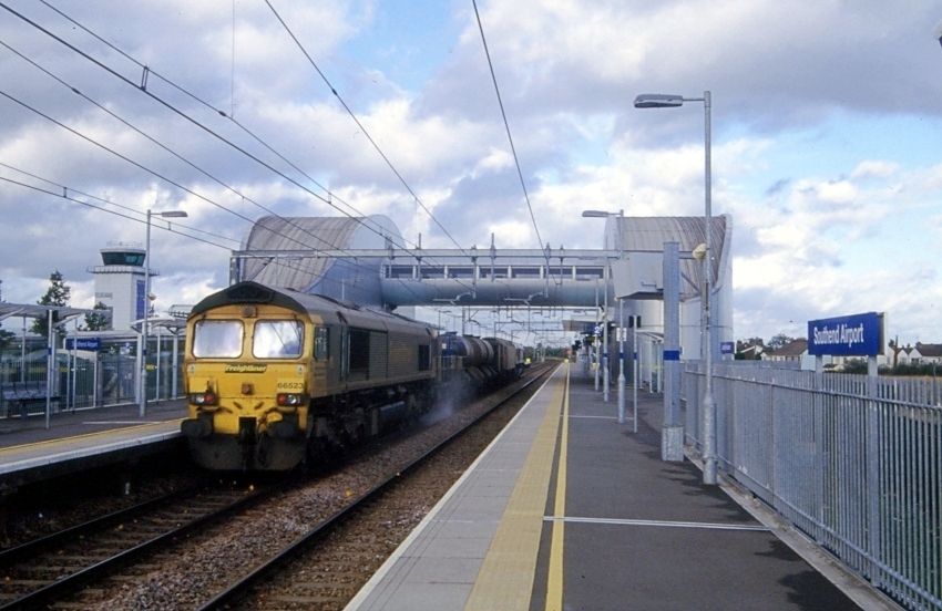 A northward (London-bound) view shows a Rail Head Treatment Train (RHTT), top-and-tailed by Class 66 No. 66523, Class 57 No. 57310, and Class 66 No. 66621, passing beneath the space age-looking footbridge. These trains are employed to clean leaf debris from the rails using high-pressure water, which is followed by the application of "sandite", the latter being a mixture of sand, ground metal, and paste, used to aid adhesion. The station was staffed and operated by Stobart from the outset. The walk from station to terminal is mostly roofed, save for a gap to accommodate the road that feeds the airport's car parks. © David Glasspool Collection