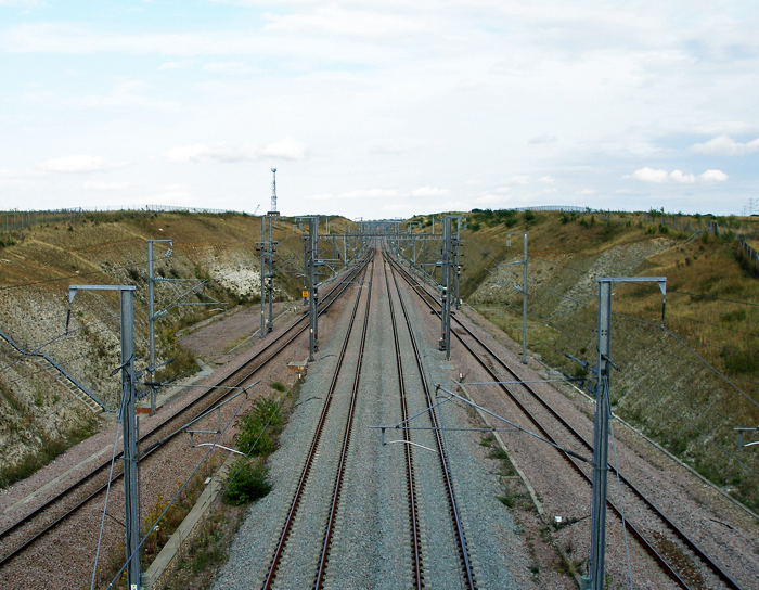 A westward view shows, in the centre, the double-track of Section 2 of the CTRL from Ebbsfleet International. It is flanked either side by the tracks of the Waterloo Connection, which merge with the CTRL behind the camera. © David Glasspool