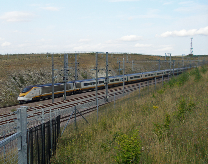 The rear of a Eurostar formation is seen on the "down" line of the Waterloo Connection, as the train joins the main CTRL, continent-bound. © David Glasspool