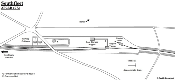 Southfleet, after the the addition of an engine shed to the APCM coal depot layout. To the south, the track singled immediately beyond the road bridge. Drawn by David Glasspool