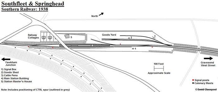 Southfleet & Springhead track plan, as of 1938. The present day positioning of the CTRL spur, outlined in grey, has been included, to show its location relative to the former station site. Click the above for a larger version. Drawn by David Glasspool