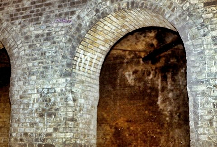 This view depicts the underside of the road bridge at the southern end of the layout. On show are the arches which ran along the southern extremity of the island platform, and our photographer notes that by this time, the underside of the bridge had acquired a thick black stain. Sadly, these arches can be viewed no more, since CTRL works have seen this area completely in-filled with earth. © Terry