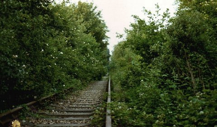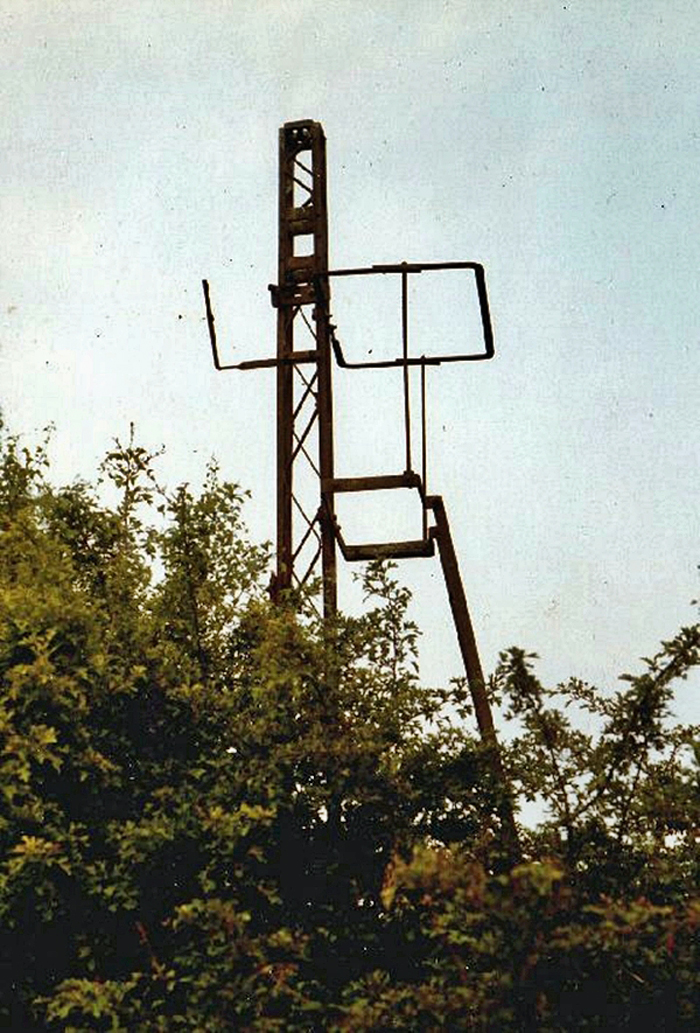 This gantry emerged from the vegetation at the northern end of the layout, nearing the A2. A similar example existed at the southern end of the site, just beyond the road over bridge, where the run-a-round loop formation converged to single-track. It is suspected that these were either signal or lighting gantries. The track here continued north of the station site, and terminated just over the other side of the bridge crossing the A2. It was here that a heavy steel gate was erected, but the photographer notes that this was not secure for long. © Terry