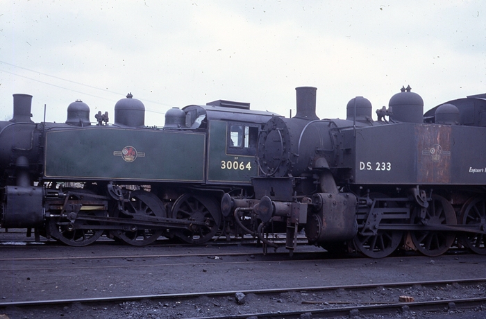 USA Tank Nos. 30064 and D.S.233 (formerly No. 30061) are seen ''on shed'' at Eastleigh on 1st April 1967. No. 30061 had been dedicated to the Engineer's Department in October 1962, when it received a new number prefixed D.S. and was employed at Redbridge Sleeper Works, Southampton. In 1966, the engine went into store at Eastleigh. No. 30064 can now be found on the Bluebell Railway. © David Glasspool Collection