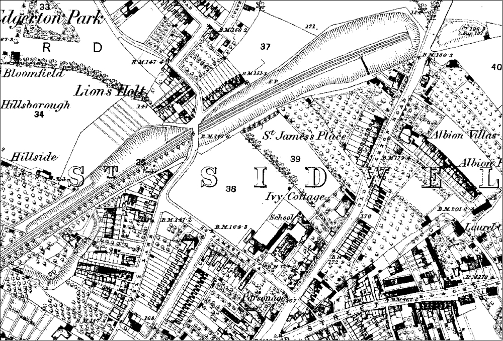The station, originally named ''Lions Holt Halt'', was commissioned in the following century, immediately west of the road bridge above the ''S'' of ''Sidwell''.