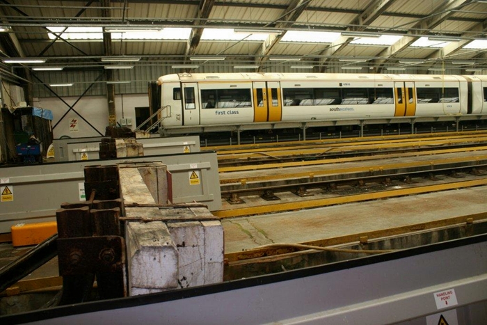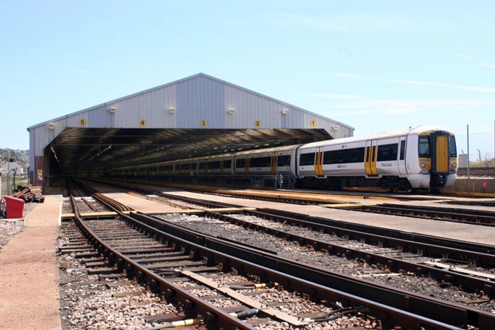 A depot by the sea. An eleven-vehicle Class 375 formation is seen stabled in No. 1 road of the original carriage inspection shed. This was built with an asbestos-clad concrete frame, but the former has recently been replaced by corrugated metal. On the extreme right of this Hastings-bound view can just be seen the single-track to the carriage washer, behind the fence. © Wayne Walsh