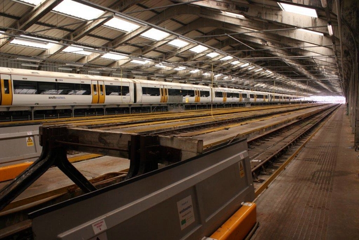 Today, the inspection shed is host only to those EMUs run by ''Southeastern'', which traverse the route via Tunbridge Wells. Hanging from the ceiling are yellow water pipes. © Wayne Walsh