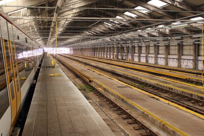 each line. These exist to protect workers, whilst carrying out graffiti cleaning, from the dangers of theconductor rail and live electrical equipment below solebar level. They move the length of the shed upon the yellow runners. © Wayne Walsh
