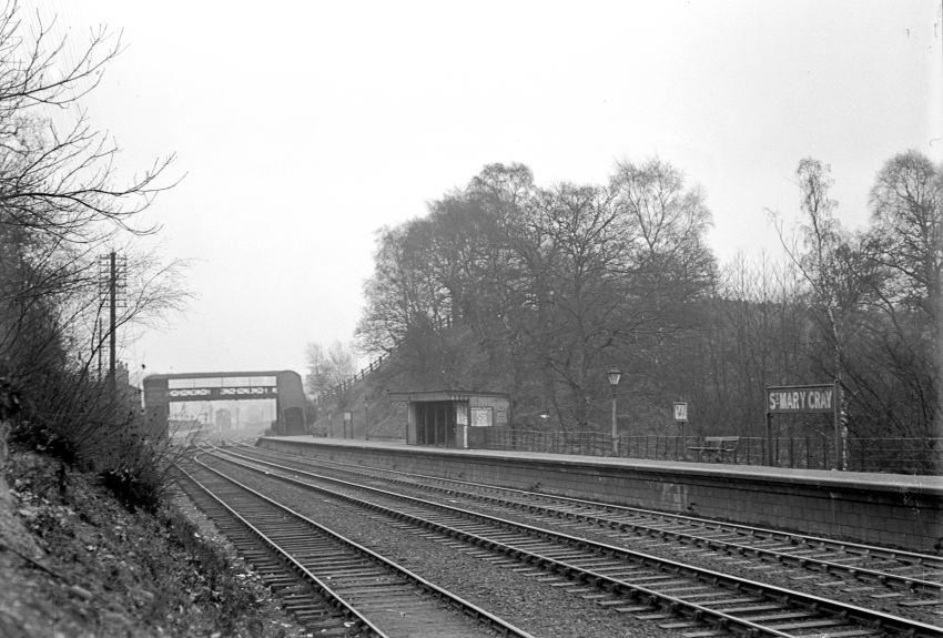 The LC&DR signal box remained in use controlling semaphore signals until May 1959. At 10:00 on Saturday, 30th of that month, the line from Beckenham Junction to Swanley was closed until 04:00 on Monday, 1st June 1959, to allow the additional two tracks to be brought into use and for the introduction of colour light signalling (ref: Southern Electric 1909-1979, G. T. Moody). The Bickley to St Mary Cray section of line was controlled by Chislehurst Junction "power box"; eastwards to Swanley was within the remit of an existing cabin at the latter that dated back to 1939. Public goods traffic was withdrawn from St Mary Cray from 7th October 1968 (ref: Branch Line Society, Supplement No. 6, January 1969); the goods shed had already gone by that time.