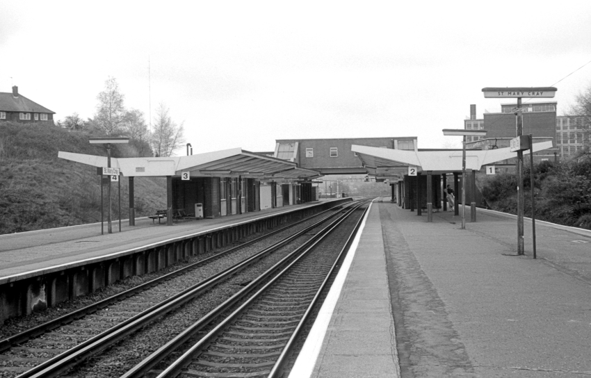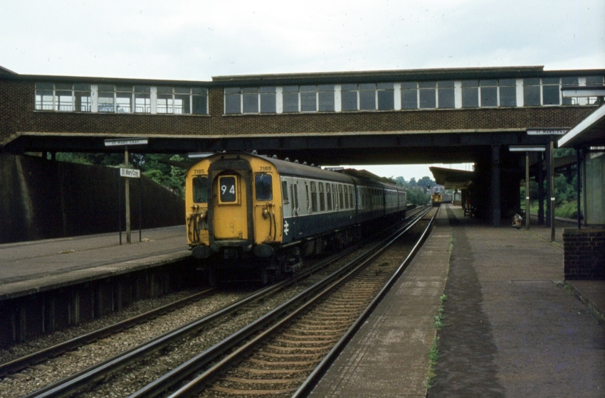 This London-bound view, which includes unrefurbished 4-CEP No. 7185 on a Victoria to Maidstone East service, shows the fully enclosed glazed walkway that was brought into use with the 1958 station, but is now no more. On the extreme right can just be seen the edge of one of four waiting shelters of brick and glass construction, again of 1958 origin, which are also no more. © David Glasspool Collection