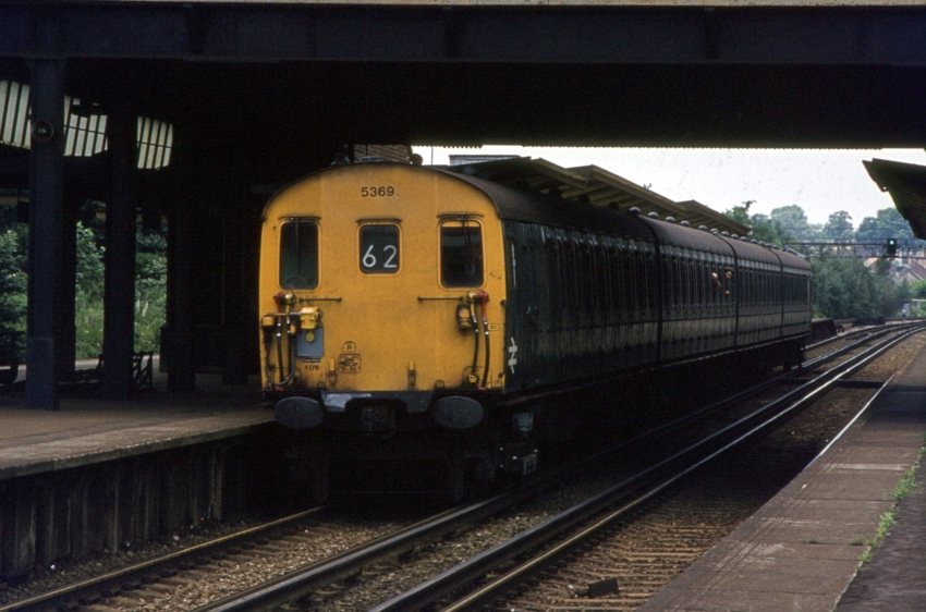 BR-designed 4 EPB No. 5369 is seen under the “raft” of the 1958 “high-level” ticket hall, forming a service to Swanley via Catford. © David Glasspool Collection