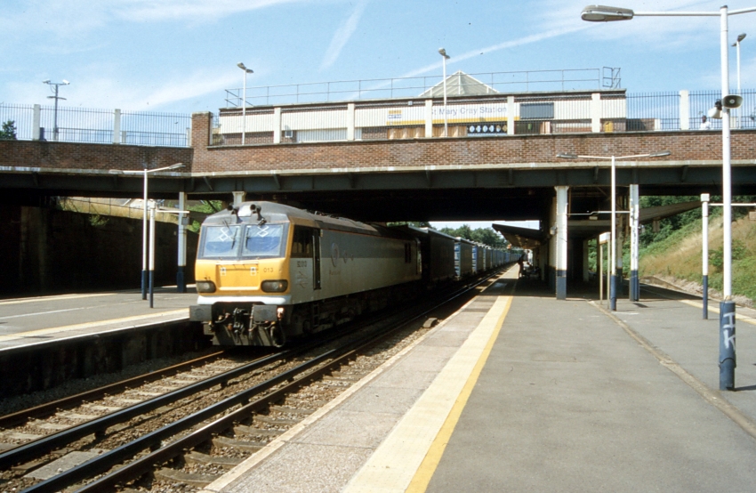 Class 92 No. 92013 is seen passing under the walkway and ticket hall of 1958, bound for Dollands Moor with G.T.S containers. It is evident that the walkway had lost its roof and glazed sides by this time; the “up” side ticket office of 1936 had also gone. © David Glasspool Collection