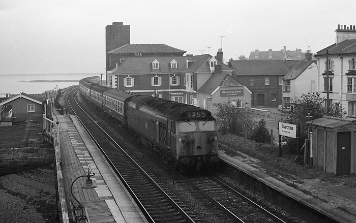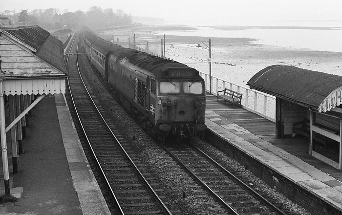 Heading in the opposite direction is Class 50 No. 50044, just as grubby as No. 50032 seen previously, but with small "Arrows of Indecision" logo on the main body side, rather than below the cab window. The pathway to the Exmouth Ferry jetty can be seen beyond the end of the "down" platform on the left, the latter of which has a surface comprising a mixture of timber and stone slabs. C. L. Caddy / © David Glasspool Collection