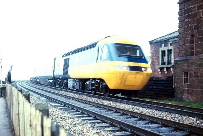 An HST in original BR Blue, Yellow, and Grey, rounds the curve in front of the former pumping house, Exeter-bound. InterCity 125 sets started running scheduled services to Devon and Cornwall in October 1979. © David Glasspool Collection