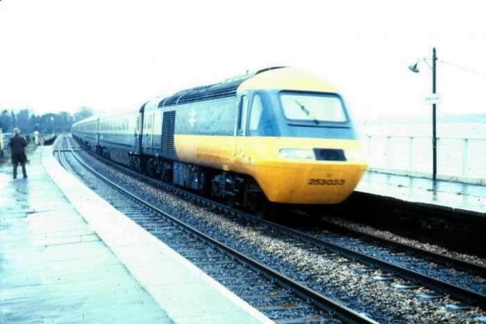 HST set No. 253033, which had power car Nos. 43134 and 43135 at either end, passes through the station non-stop, Plymouth-bound. © David Glasspool Collection