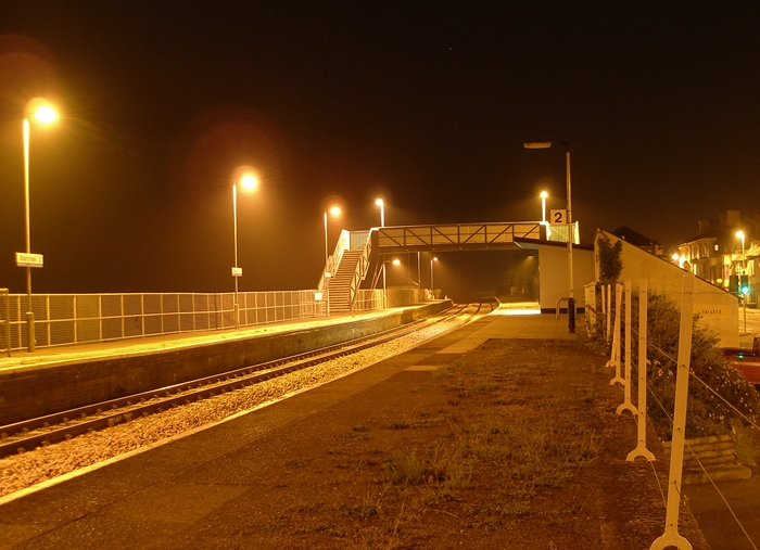 A southward view on a warm night shows the replacement footbridge of 1999 and the well-lit platforms. The ''down'' platform had received new railings and been resurfaced. Weeds could still be seen on the ''up'' side, but were not as numerous as those seen in 1981. © David Glasspool