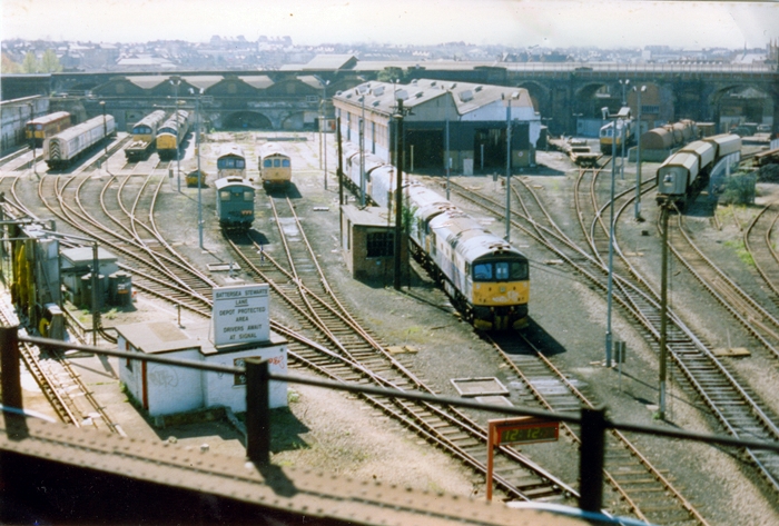 This panorama of Stewarts Lane, taken from the "Chatham" approach to Victoria, includes a series of withdrawn diesels of Classes 33 and 37. On the far left, in the corner of the former engine shed, can just be seen Electro-Diesel Nos. 73131 and 73128, freshly out-shopped in the then new EW&S red and yellow colours. The two-track diesel shed comprises the same roof pattern as that produced by the SR for the engine shed in 1934. The viaduct in the background carries the South London Line between Wandsworth Road and Battersea Park stations. © John Horton