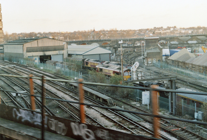 The triple-track electric locomotive depot, commissioned for the 1959 Kent Coast Electrification Scheme, is prominent on the left-hand side in this view taken from the "Chatham" approaches to Victoria. Beside it is the triple-track carriage washing shed, whilst on the far right is the edge of the engine shed. The large carriage shed is situated behind the viaduct in the background. An interesting locomotive collection is in evidence - from left to right: an ex-Gatwick Express Class 73, two Class 67s (the furthest being No. 67025), Class 66 No. 66127, and ex-LMS 5MT No. 45407 ''Lancashire Fusilier''. © David Glasspool