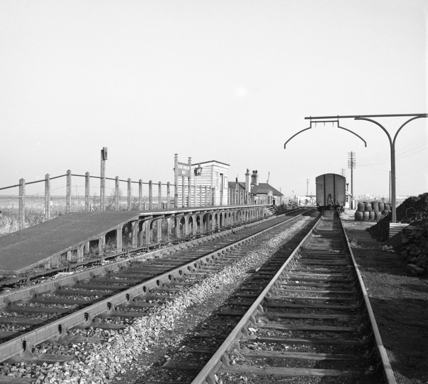 An eastward view has Stoke Siding, which dated from the line’s earliest years, in the right foreground, flanked on one side by stacks of coal and equipped with a loading gauge. The signal box can just be glimpsed emerging from behind the van in the background. To the left of the van can just be seen the gates of Stoke Level Crossing, beyond which is the junction between Allhallows-on-Sea and Grain branches. Continuing in the left background is the roof of the crossing keeper’s cottage and, finally, the prefabricated concrete platform of Stoke Junction Halt. Unlike the other halts along the branch from Hoo Junction that were rebuilt wholly in prefabrication concrete, Stoke Junction retained a timber waiting shelter for its entire career. © David Glasspool Collection