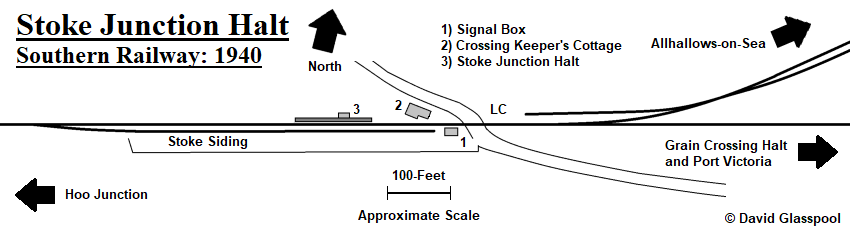 On 14th May 1932, the Southern Railway (SR) opened a 1¾-mile-long single-track branch line to Allhallows-on-Sea, upon the Hoo Peninsula in North West Kent. The branch had been authorised in June 1929, construction started in August 1931 (ref: The Railway Magazine, March 1933), and it joined the 1882 Hoo Junction to Port Victoria line 9¾-miles east of the former. The point of divergence of Port Victoria and Allhallows-on-Sea routes was named "Stoke Junction", which had until that time been the location of a level crossing, gate box, crossing keeper’s cottage, and a siding on the southern side of the line.