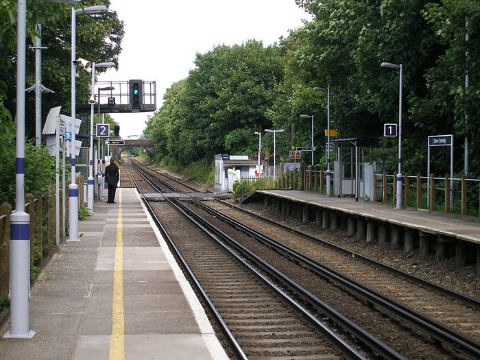 The station underwent a refurbishment programme during 2008, which sought to replace the platform name boards, eliminate the waiting shelters, and apply a new colour scheme. The signal box remains to control the pedestrian access to the level crossing. © David Glasspool