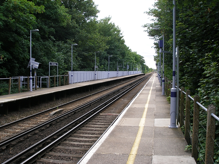 Even the prefabricated concrete platform backing has not escaped the prevailing ''battleship grey'' colour scheme. Despite the leafy surroundings, there is constant noise at the station, generated by the nearby Dartford Crossing. © David Glasspool