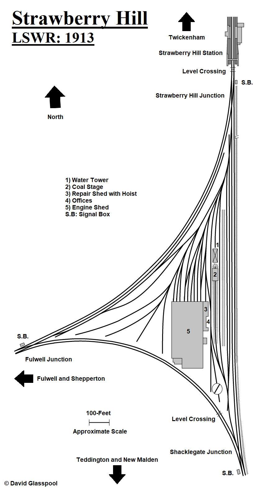 The 1894 Ordnance Survey Edition does not show the double-track that eventually formed the southern side of today’s triangle at Strawberry Hill. However, this spur was evident in plans of the then new engine shed published in the July 1897 edition of The Railway Engineer, suggesting that it was laid at that time.