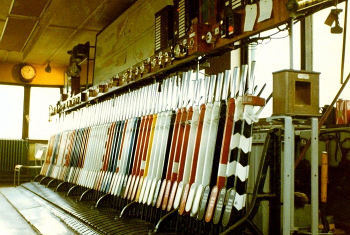 An impressive line-up of seventy levers could once be found inside the Junction cabin. Red levers corresponded to ''stop'' signals, black levers controlled points, white levers were designated ''spare'', and yellow levers were for ''distant'' signals. The signal levers with black and white chevrons operated detonators: the chevrons pointed upwards for the ''up'' line and downwards for the ''down'' line. © Roger Goodrum