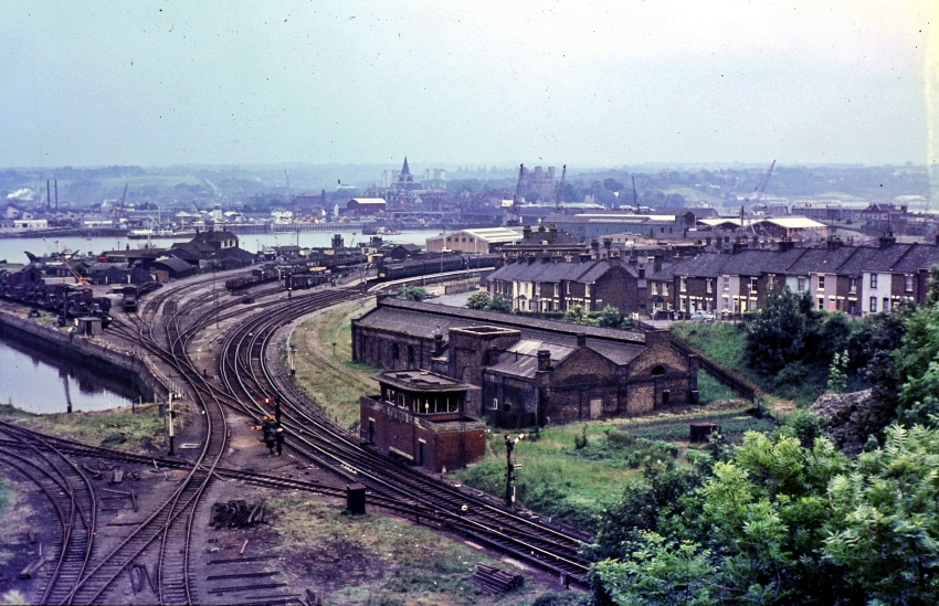 A southward view from atop the chalk ridge shows the tracks to Strood Dock (the former canal basin) diverging to the left, and the running lines to the station (where a BR (S) Green 2-HAP can be seen) curving sharply to the right. The reverse “L” shape of the former engine shed, on the right, is evident; the structure was minus its water tank by this stage, but the base which once supported this is clearly evident, complete with glazed arched window. Note that the pitched roof of the offices lacked the centrally-located vent of the engine shed. The former shed building was demolished in 1970; the signal box in front, which dated from 1939, closed the following year. The coal yard, to the left of the station, was packed with wagons, and eagle-eyed viewers may just be able to pick out the closed Rochester Bridge station on the distant horizon, to the far right. © Terry Tracey
