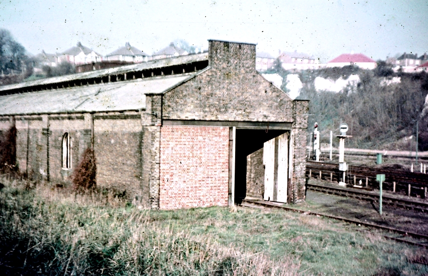 This northward view offers a rare close-up of the former engine shed, which by this time was over a century old and had been closed to steam traction for 25 years. The track which can be seen entering the building follows the original alignment from when the shed first opened and it is evident that this entrance still retained wooden doors. It is obvious that the opening through which the second track - laid in the 1890s - passed has been bricked up. The brickwork looks too recent to have been constructed immediately after closure in 1939, so it is likely post-war in origin. The siding to the right of the building formerly led to the turntable and coal stage. The overgrown area on the left was once occupied by a siding which was laid in the 1890s, but lifted after the shed closed in 1939. The office section - described in the main text as “the bottom of the L” - shared the same roof profile as the main shed shown here; it was, however, only about a third of the length of the latter. The banner repeater on the right was for the signals at the portal of Strood Tunnel, which would have been obscured as a result of the sharp curve from the station and the presence of the signal box. © Terry Tracey