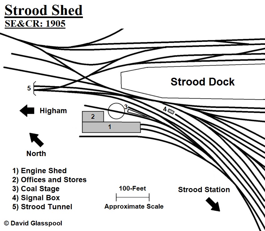 The floor plan of Strood shed was a reversed L-shape, the main part of which measured 30-foot wide by 170-foot long. It comprised a slated pitched roof and was constructed from the same yellow brickwork which the SER had used for stations along the line, such as those at Dartford and Gravesend. From the outset, just a single, dead-end track entered this part of the shed from the south. The smaller part of the building - the bottom of the "L" - was also 30-foot wide, but just 60-foot long; it comprised offices, but was never host to a track, and inset to it was a water tank. A turntable was situated immediately east of the shed’s offices and a characteristic of the depot from the earliest years was that it could only be accessed by locomotives reversing into a head shunt to the south.