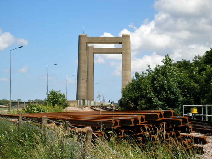 A batch of rust-covered rails reside in the foreground of this Sheppey-bound view. A barricade separates both rail and road. No conductor rail exists on the lifting section of the bridge since no physical electrical connection can be made. However, since units have electric pick-up shoes on both front and rear trailers, no current is lost. © David Glasspool