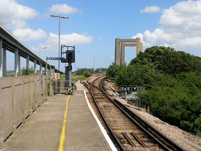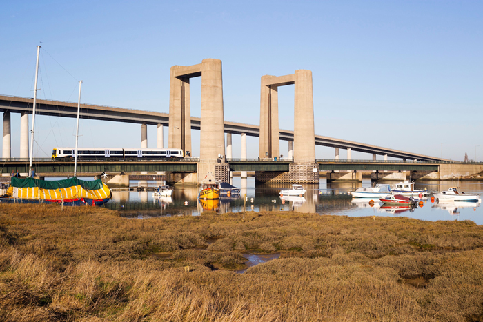 A boom in car travel throughout the 1960s meant that, by 1970, the Kings Ferry vertical-lifting bridge was already carrying much more traffic than it was designed for. The delays caused were exacerbated by the fact that boats took priority over cars, and every time a vessel needed to pass, a total of three minutes were spent raising and lowering the lifting span to its full extent, in addition to the time spent waiting for a boat to go through. Consequently, support for a high-level bridge quickly gathered momentum, but three decades would pass until a solution materialised. It was not until 29th April 2004 that construction work began on a new £100,000,000 fixed-link 115-foot high road bridge. The new structure took two years to complete, being built on a site north of the existing bridge, and used 2,380 tonnes of concrete. It is estimated that 26,000 vehicles cross the four-lane bridge each day, which opened on 3rd July 2006. The bridge of 1960 remained, of course for railway operation, and it also retained its road section as an alternative route.