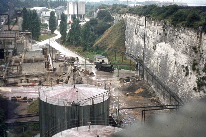 Photograph 1: R. & W. Hawthorn, Leslie & Co saddle tank No. 6 is seen in the exhausted chalk pit on the southern side of London Road. In front of the engine can be seen the entrance to the tunnel which takes the railway through the chalk ridge, linking the pit with the main part of the cement works. © David Glasspool Collection