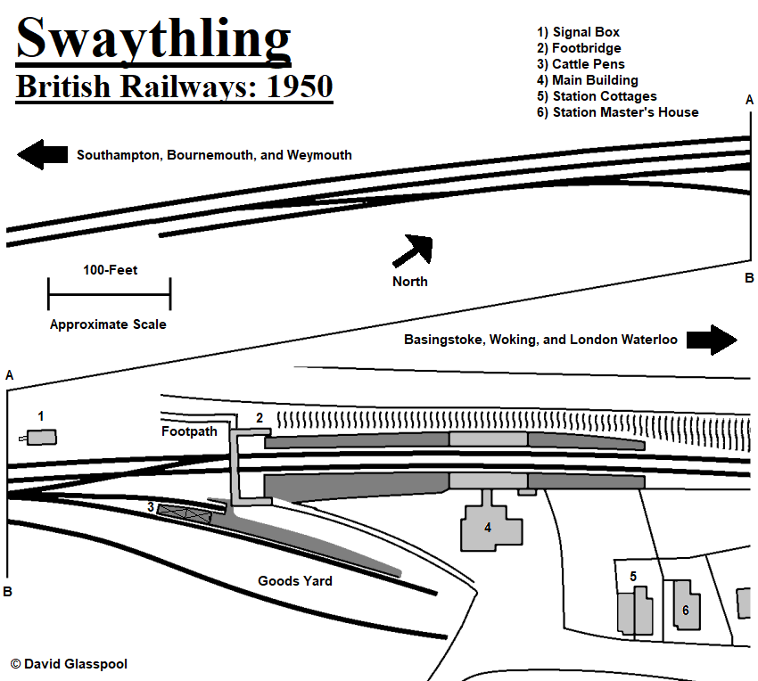 Two platforms were situated either side of the double-track line. The main building was located on the "down" platform; this was a neat single-storey red brick building with a hipped tiled roof and arched windows. The structure was a variation of a standard design, and similar buildings also came into use at intermediate stations beyond Southampton, such as at Hinton Admiral, Sway, and New Milton. Unlike Swathling, however, the buildings at those sites incorporated a two-storey-high Station Master’s house. At Swathling, the Station Master's house was remote from the main building, a detached property being situated to the east of the platforms, beside the adjacent road. This structure was accompanied by a block of semi-detached railway cottages, and their positions relative to each other and the station can be seen on the diagram below.