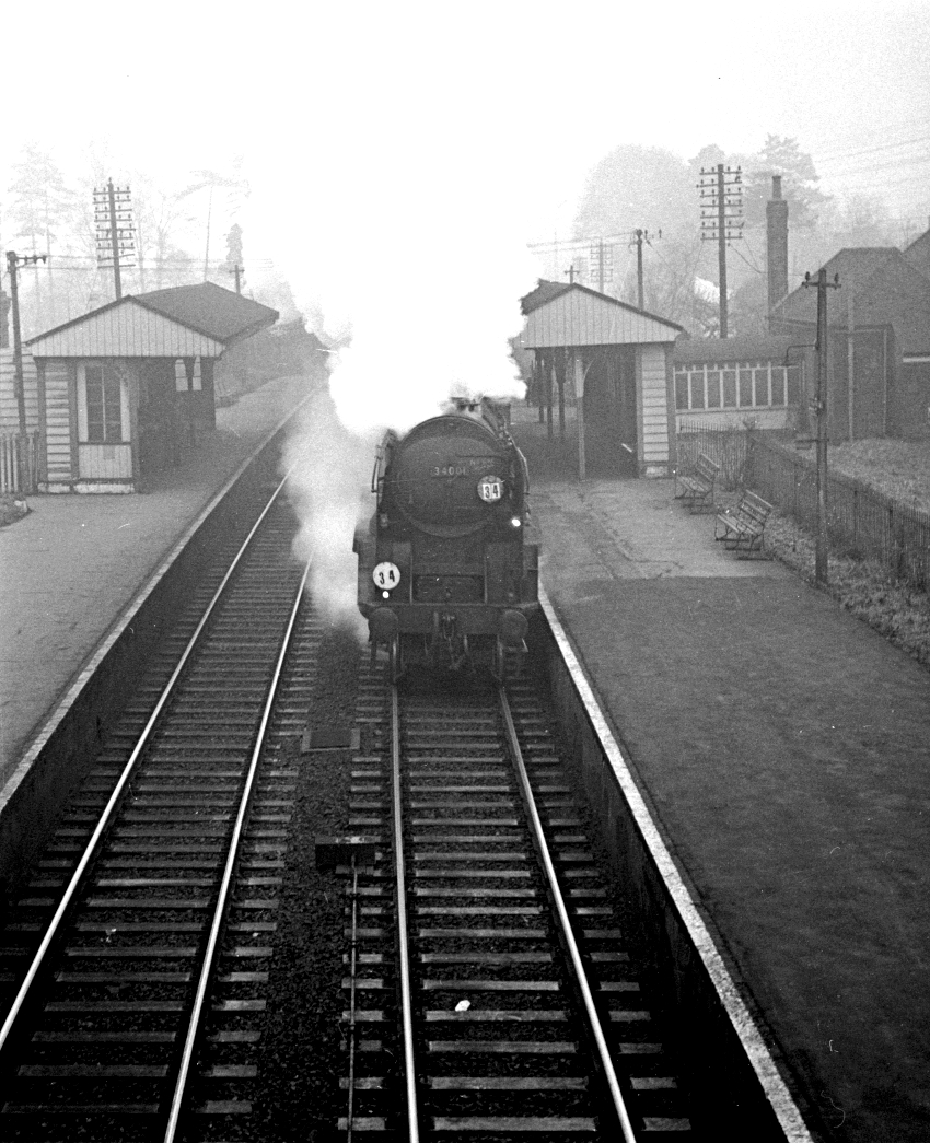 Rebuilt "West Country" Class No. 34001 "Exeter" is seen passing through non-stop in the "down" direction with a Bournemouth West service. On the right can be seen the rear of the station building and the covered walkway which links it to the covered portion of the "down" platform. On the left can just be seen the clapboard waiting shelter which backed onto the "up" side platform canopy. Those parts of the windbreak of the "up" side canopy that contain glazing are not original features, being later additions. The canopies' timber triangular end screens in this view are also of a simpler design to the originals; previously, these were akin to those still in use at New Milton. Southern Railway concrete lampposts with "Target" name signs are in evidence.s © David Glasspool Collection