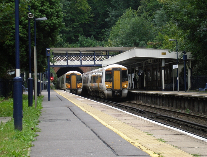 Just passing through: Class 375 unit Nos. 375708 and 375703, on the left and right respectively, pass each