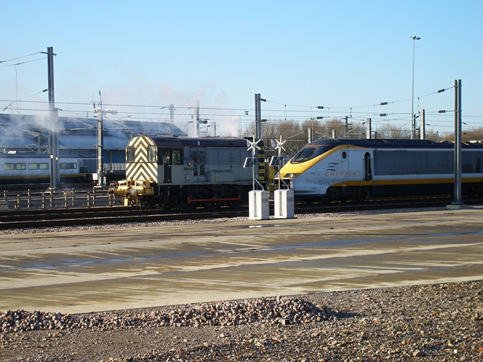 Class 08 No. 08948 is the depot shunter, and is seen here coupled to Class 373 No. 3101, shortly after being started up. The diesel was brought over from North Pole Depot and features extended buffer beams at both ends. The locomotive is equipped with ''Scharfenberg'' couplers, allowing it to attach to Class 373 stock. © David Glasspool