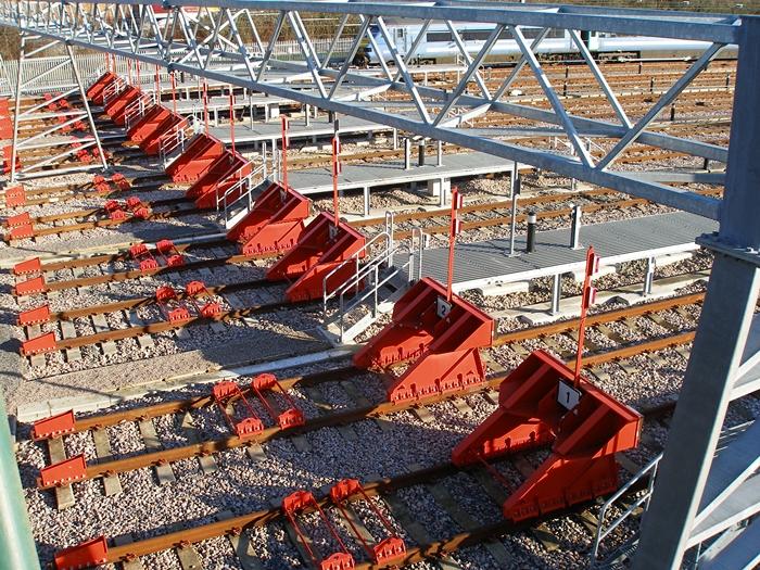 The abandonment of Waterloo International as a second London hub negated the requirement for Eurostar sets to be equipped with third rail pick-up apparatus. As a result, Temple Mills has only been electrified with 25kV A.C. overhead wires, which extend into the main depot building over all eight tracks. It is envisaged that the removal of third rail gear from train sets will bring significant maintenance cost savings. Indeed, with wires extending into the main depot building, one could be forgiven for wondering how repair crews can safely access the roof areas of trains. Six of the eight roads are equipped with ‘’pull-back’’ wires, which means the overhead electrics can be removed and replaced as and when required. The voltage over each track can also be varied from the standard 25 kV, down to 1500V and 3000V. At the depot structure’s north western end is an additional building housing all heavy repair gear, which includes overhead cranes (for removing power car transformers), a bogie drop pit, and a wheel lathe, the latter two of which were contained within separate sheds at North Pole. On the depot approach tracks can be found an automatic train washer, which trains can pass through when arriving or leaving the site.