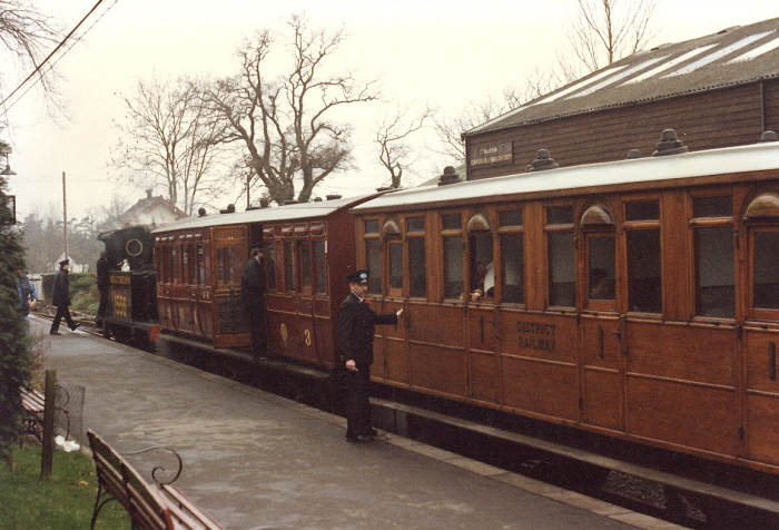 ''P'' Class 0-6-0 Tank Engine (wearing Southern Railway black livery); the first carriage is Stratford-built