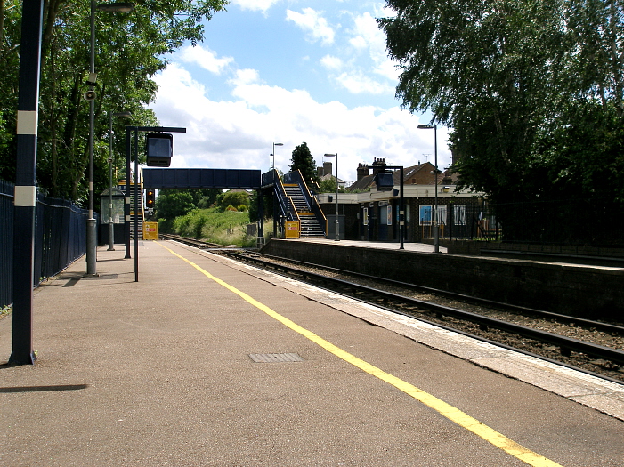 A Faversham-bound view shows the footbridge's completely new steel span across the running lines whilst, emerging to its right is the station building of 1970. On the right of this view is the surviving goods shed which, although crème brick in construction, complete with orange lining, has been much dirtied over the years. © David Glasspool