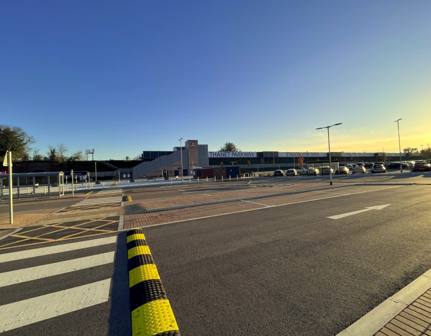 The banner running along the side of the station at platform level reads: "Thanet Parkway - Station Now Open - 70 Minutes To London". The bridge under the running lines, linking both platforms, can just be seen on the left, obscured by the bus shelter. © David Glasspool