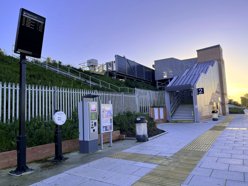 Now at ground level, at the foot of the embankment, a south westward view shows the roofed metal staircase that serves the Minster-bound platform. Ticket machines are provided on both sides of the railway at this unstaffed station. © David Glasspool