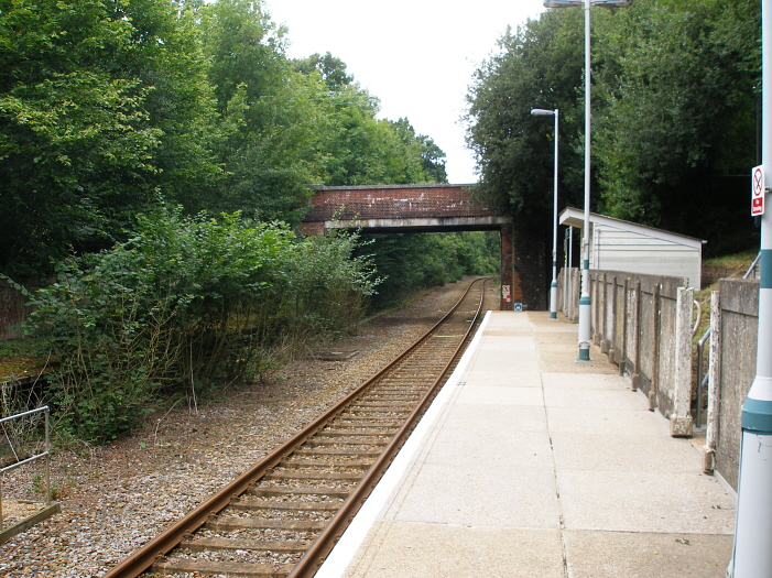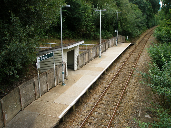 A northward view reveals the road bridge from which the station first took its name (''Three Oaks Bridge Halt''), before this suffix was replaced by ''& Guestling''. The disused ''up'' platform is still in evidence, and can be seen emerging from the vegetation on the left. © David Glasspool