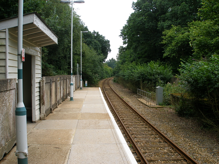 The remaining single platform is similar to that still in use at Doleham, but the prefabricated concrete came to Three Oaks about twenty years later than it did at the former. The sloping entrance path can be seen behind the clapboard waiting shelter. © David Glasspool