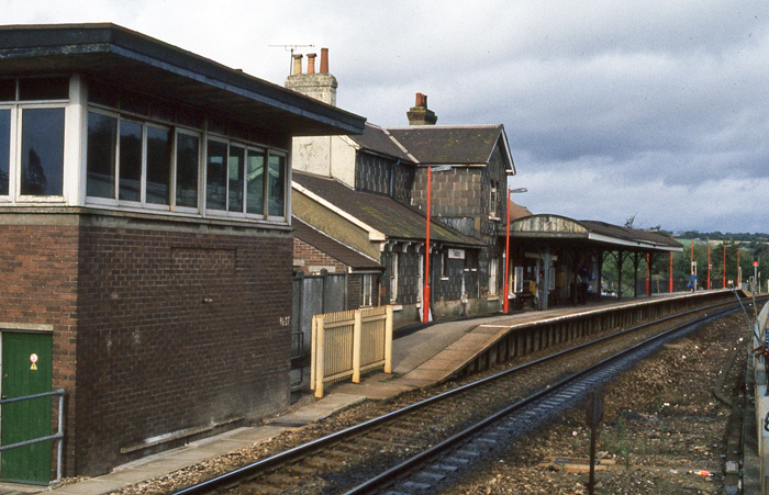A Salisbury-bound view captures the remaining operational platform face which was left after singling of the line in 1967. Note the slate tiles hung on the main building's wall surfaces, which were common features of stations between Salisbury and Yeovil. They were not, however, unique to the line and, even though they have since been removed from Tisbury, the tiles can still be observed on the former Station Master's house at Ashurst, New Forest. The surviving canopy was looking tired by this time; the same design once graced the former "down" platform. Prominent in the left foreground is the former signal box of 1958, which since the year of this photograph had contained a back-up emergency panel to control that section of the line between Tisbury Loop and Gillingham, in the event of any signalling failures. Since 27th February 2012, this section of the line has been controlled from Basingstoke Signalling Centre. © David Glasspool Collection